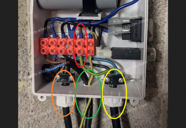 On ne sait où va le fil de terre relié dans le boitier et qui sort au centre ... pompe ?