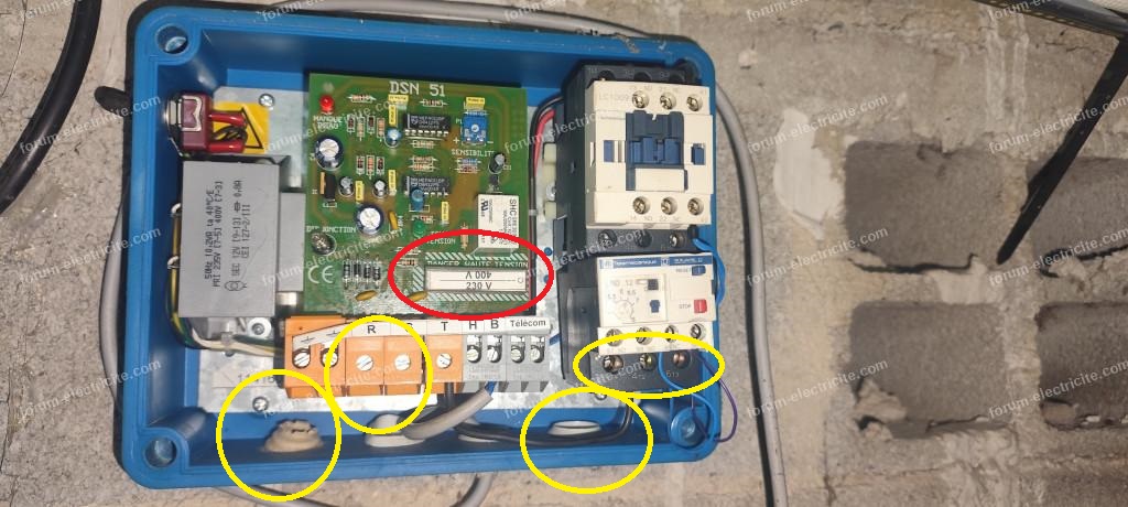 Le boitier DSN 51 ne semble pas avoir de câble d'alimentation et il ne semble pas non plus y avoir de départ vers la pompe ou son boitier de démarrage.
